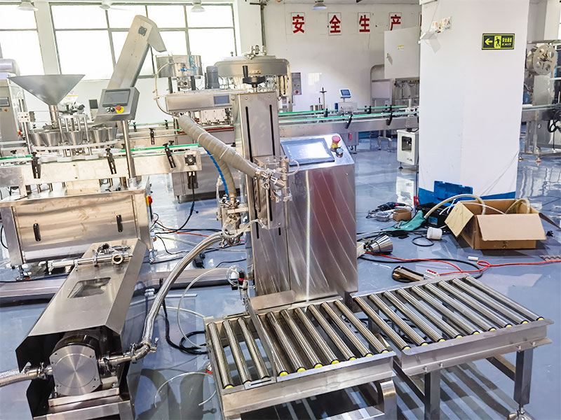 大型化工液體灌裝設備主要由自動化控制系統執行,工作人員將空桶防止在輸送帶上,開啟綠色灌裝按鈕,光電傳感裝置在檢測到灌裝桶到位時,氣動夾具自動夾緊,系統開始自動扣除空桶重量,進行去皮處理,大型化工液體灌裝設備將會進入灌裝準備狀態,灌裝頭開始插入容器桶內,打開防爆電磁閥,物料順著流入桶內,稱重感應裝置將實時反饋重量信息的變化,便于工作人員查詢,PLC控制閥門將會實現快、慢速切換模式,以此達到灌裝精度的準確,充填結束后,閥門關閉,灌裝頭回吸并提升,隨之進入旋蓋工位,振動盤則把需要封蓋的容器逐一上蓋,機械臂抓蓋,伺服旋蓋頭將按預設扭矩完成旋蓋任務。